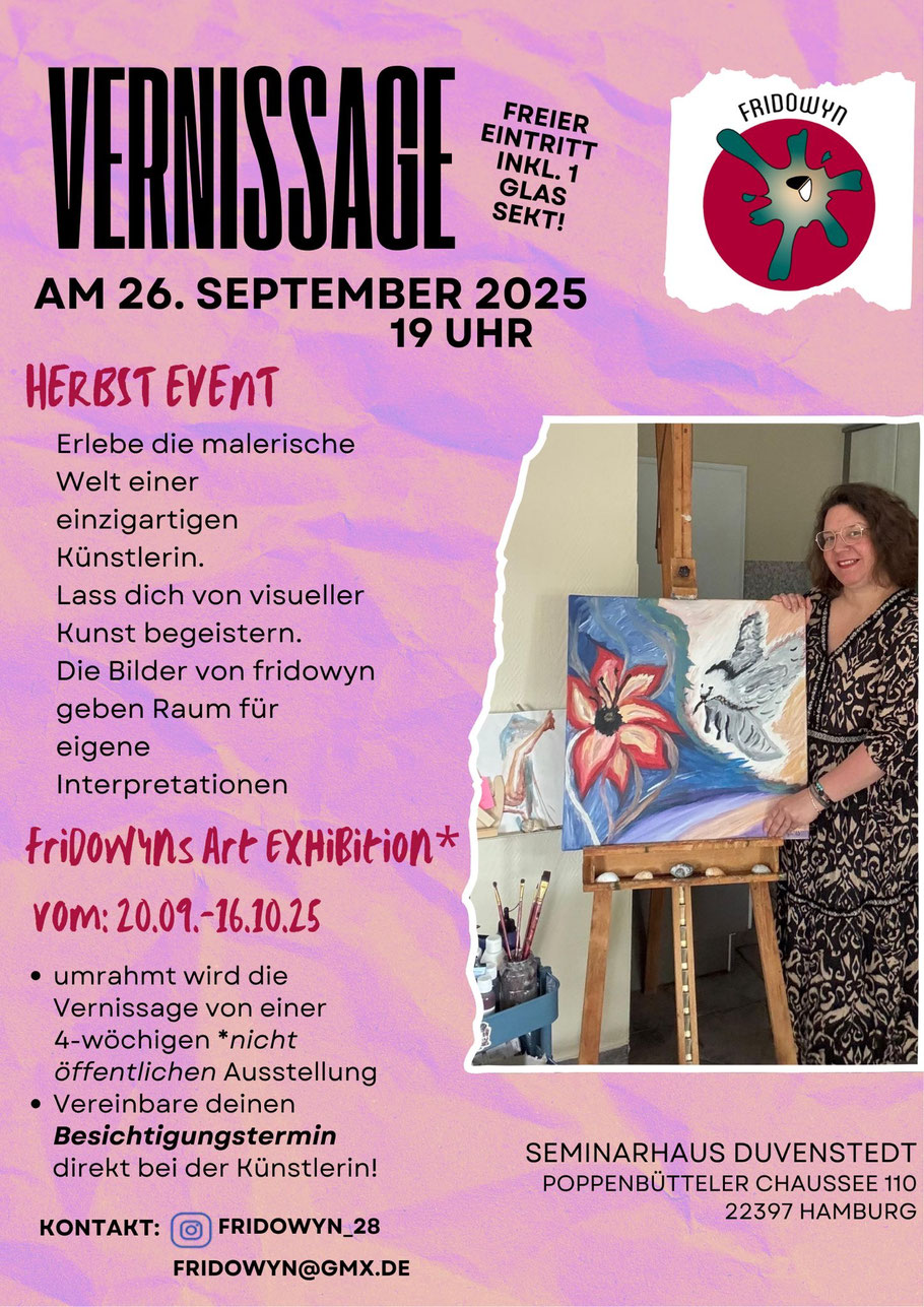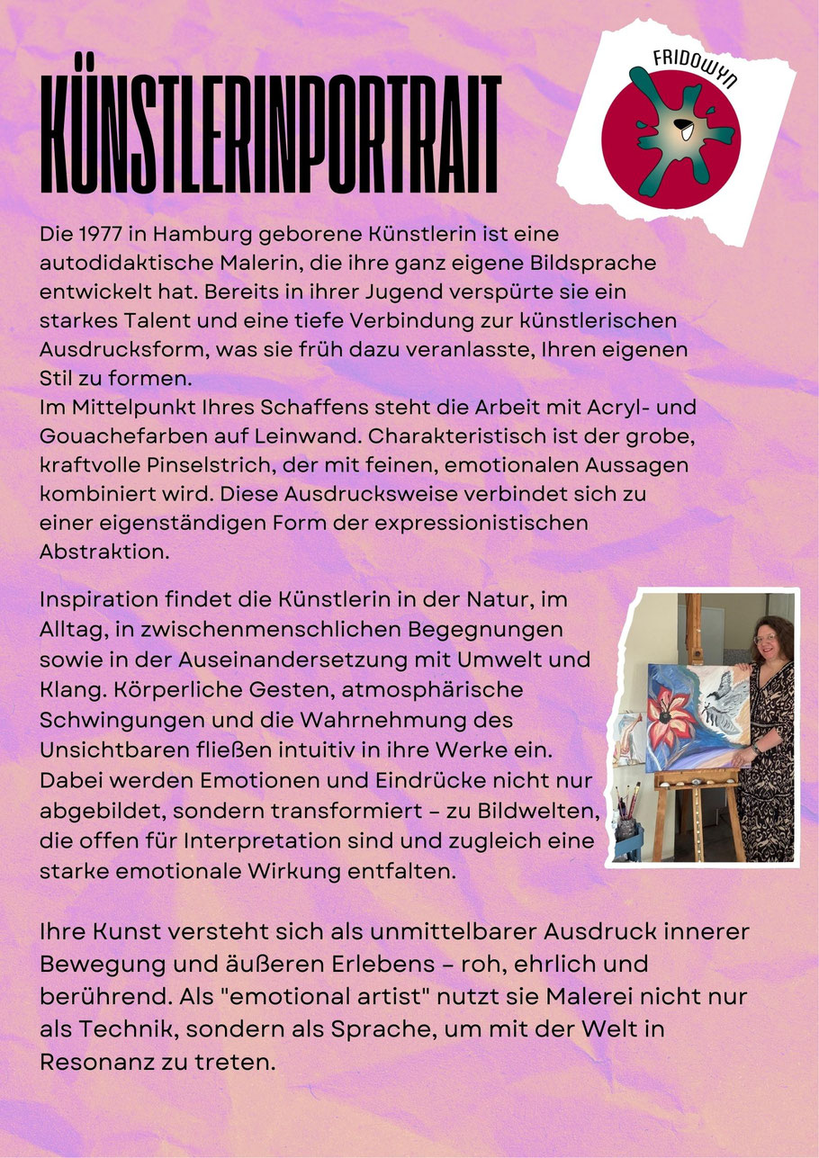 Vom 19. September bis 17. Oktober 2025 präsentiert die Künstlerin Fridowyn in unserer Halle ihre Werke. Als EMOTIONAL ARTIST erschafft Fridowyn Bilder, die nicht nur gesehen, sondern auch gefühlt werden. Ihre Malkunst auf Leinwand erzählt dabei keine klaren Geschichten, sondern lädt dazu ein, die eigene Deutung beim Betrachten zu finden.